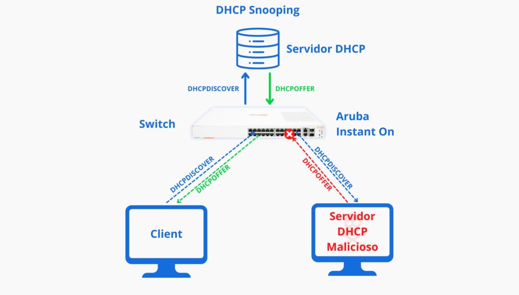 A linha Aruba 1960 inclui suporte a DHCP Snooping, um recurso que bloqueia servidores DHCP não autorizados e evita ataques que tentam assumir controle da rede através de distribuição de IPs falsos.